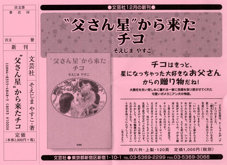 皆さん、副島泰子さんの本をご紹介します。「そえじまやすこ」さんは私の会社入社同期生、副島保宏君の奥様です。保宏君は残念ながら20年も前に病に倒れ若くしてこの世を去りました。以後奥様は女手ひとつで2人のお嬢さんを立派に育て上げ今日に至っていますが、人生の節目にと、このたび「父さん星から来たチコ」という本を出版されました。若くして夫に先立たれた奥様が2人の娘さんを立派に育て上げるのにいかばかりの苦労をされたか、また、お嬢様はどんなにかさみしい思いをされたか、想像にかたくありませんが、この本ではお父さんが贈ってくれたとしか考えられない一匹の犬を心のよりどころに、親子3人がけなげに生きる姿を、肩ひじはらずに書かれており、一遍の詩を読むような
