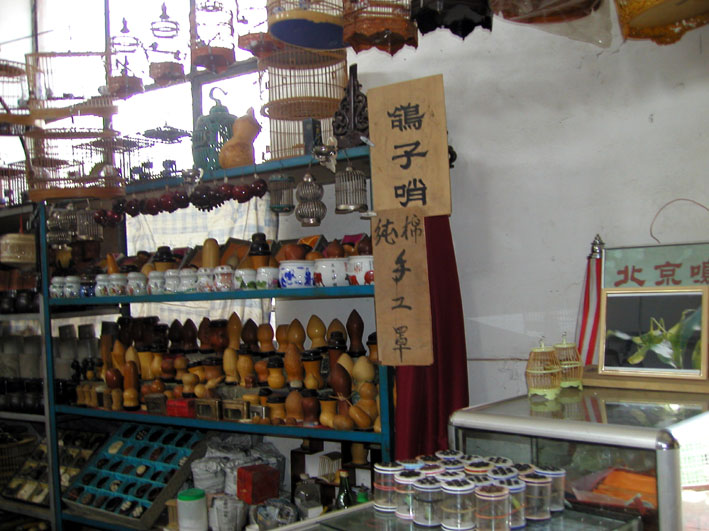 むこうの棚におびただしい、こおろぎ飼育壷?が。どうも看板に「手工品」と書いてあるようだが、どなたか中国語の達者な方SOS。