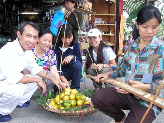 ハノイ旧市街にて、レモン売りのおばさん・がんばる。レモン6個と柿(小)が10個で120円! Nov.11, 2002 Friendly sellers and potential customers, Hanoi, Vietnam