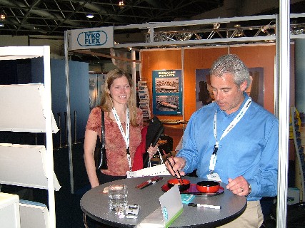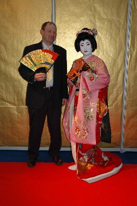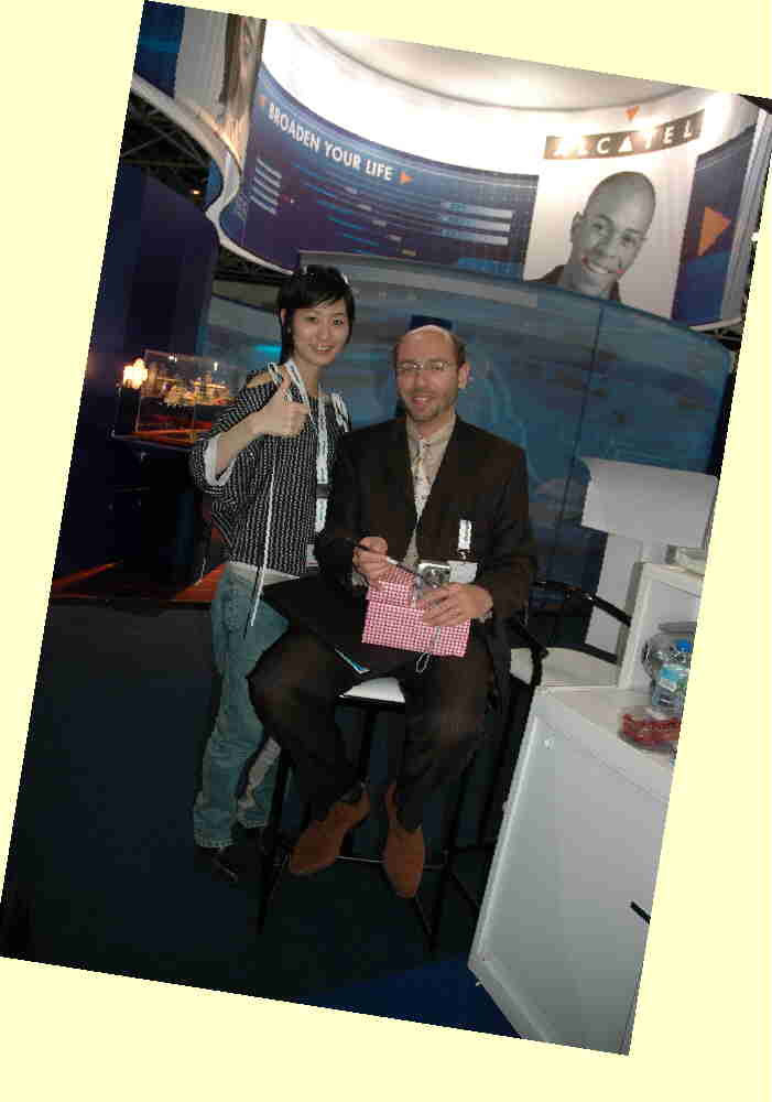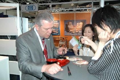 ブースでは箸ゲームで盛り上がった。ピスタチオを箸で1分間にいくつ別の器に入れられるか?というもの。会期中の高得点者にはDigital Cameraを進呈。多くの参加者があった。ちなみに1等賞はフランス人であった。