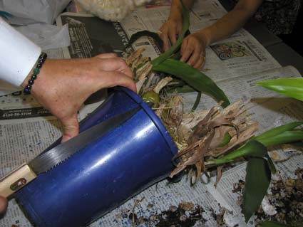 もう一鉢は難物です。3−5年間株分けしていなかったので、根がびっしりプラスティック鉢に張り付いて、引けどもびくともせず。予めそれを予想して用意してあった「のこぎり」登場!